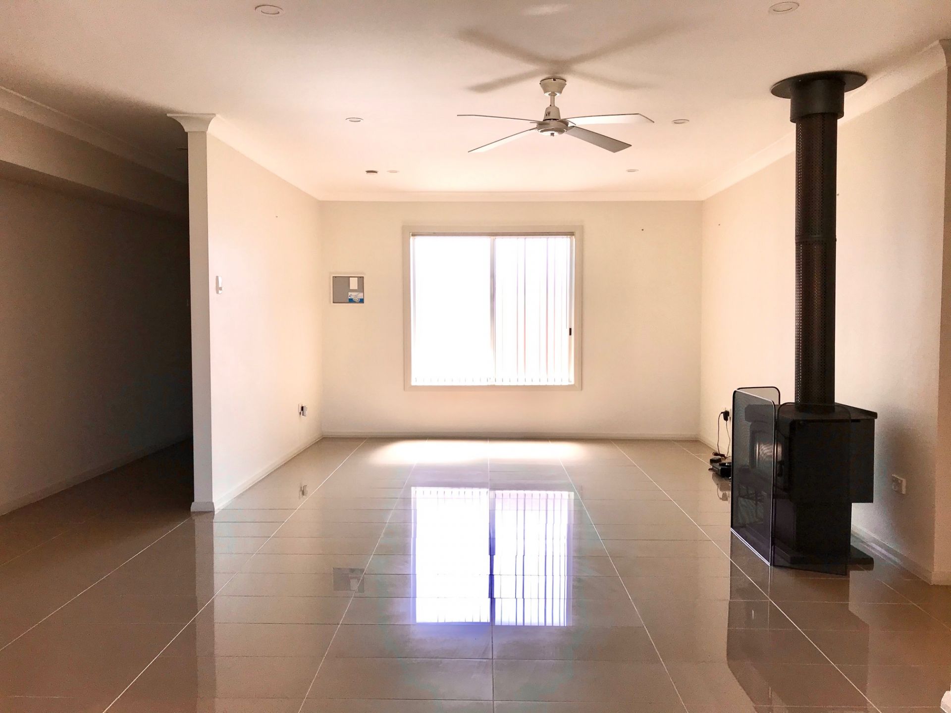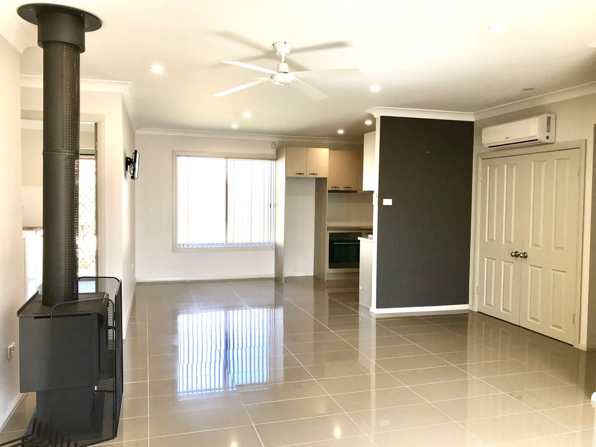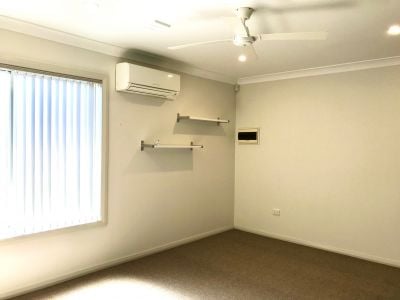 Inside, you'll find three generously sized carpeted bedrooms, each with large built in robes and ceiling fans. One bedroom includes a split system air conditioner, while the master suite features a private ensuite and its own wall-mounted LCD television. The open plan living, dining, and kitchen area is tiled throughout and designed for flexible furniture arrangements, complete with a split-system air conditioner for year-round comfort and a gas fireplace for cosy winter nights. The kitchen is well-equipped with modern appliances, ample cupboard and bench space, and multiple built in storage and pantry options.